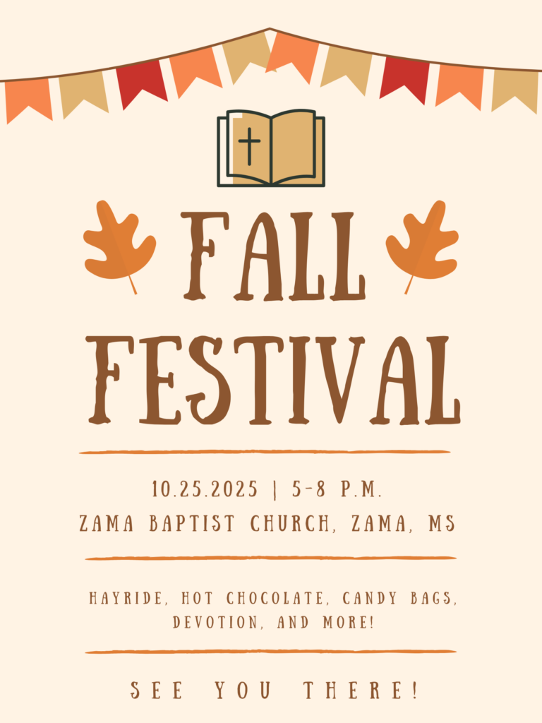 Zama Baptist Church will hold their annual Fall Festival on October 25, 2025, from 5-8 P.M. on the church grounds. The church address is 2440 Attala Road 5040 Kosciusko, MS, United States, Mississippi 39090.